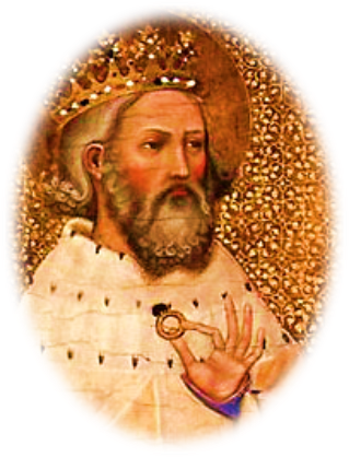 Se trata de San Eduardo, quien nació en Islip, Oxfordshire-Inglaterra, en el año 1003. Hijo de Eteiredo II, que por cierto le decían “el indeciso” por su debilidad de carácter y de Emma de Normandía, quien por su belleza era conocida como “La rosa de Normandía”. Y Eduardo es conocido como “Eduardo el confesor-Rey” de Inglaterra. Su nombre significa “Guardián de gloria”. Fue proclamado rey de Inglaterra en el año 1042, tras 25 años fuera de Inglaterra a causa de las rivalidades y los conflictos políticos; finalizando su reinado en el año 1066. Durante los 25 años fuera de Inglaterra, peregrinó hacia Roma, y el papa León IX le solicitó la construcción de un monasterio al oeste de Londres, monasterio hoy conocido como la célebre Abadía de Westminster.
